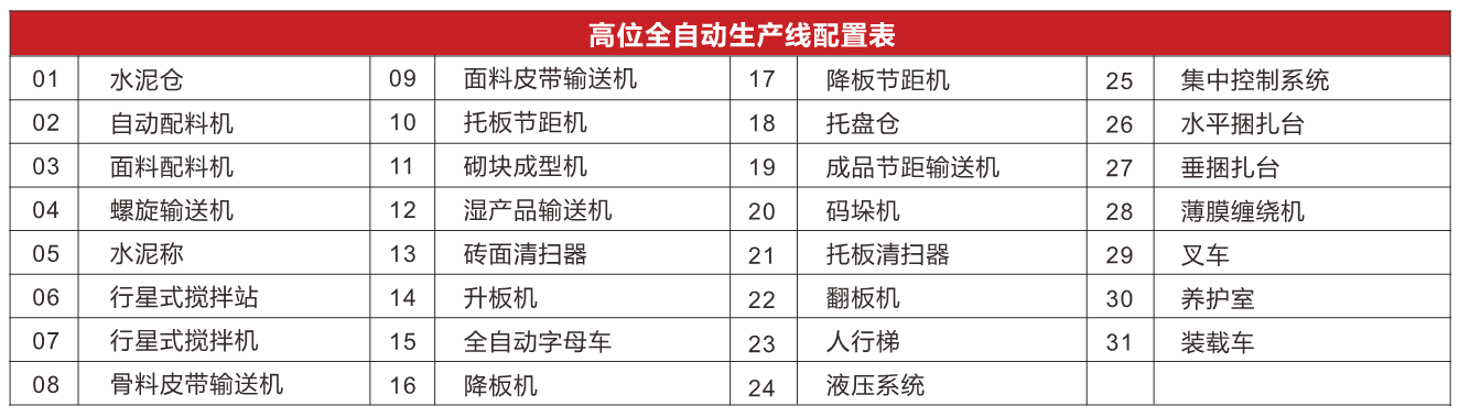 該全自動(dòng)砌塊生產(chǎn)線采用閉環(huán)生產(chǎn)流程設(shè)計(jì),由電腦、各種傳感器、機(jī)電液壓、機(jī)械組件組成,整個(gè)生產(chǎn)過程都是由 電腦控制,機(jī)械自動(dòng)化完成。包括:原材料的感測(cè)計(jì)量含水率、智能動(dòng)態(tài)調(diào)整攪拌水分比、濕料輸送成型生產(chǎn)控制、 濕產(chǎn)品輸送、電梯式立體升疊、子母擺渡車轉(zhuǎn)運(yùn)至養(yǎng)護(hù)窯養(yǎng)護(hù)、子母擺渡車自動(dòng)識(shí)別空窯和窯量、將未養(yǎng)護(hù)的濕產(chǎn)品 送入窯中養(yǎng)護(hù)、將已完成養(yǎng)護(hù)的干成品送至降板機(jī)、分層降送到干產(chǎn)品輸送機(jī)上、傳送到碼垛區(qū)、自動(dòng)碼垛抓手將養(yǎng) 護(hù)的干產(chǎn)品根據(jù)需要堆碼到托盤上約一個(gè)立方一跺、平板車輸送到自動(dòng)打包區(qū)等。